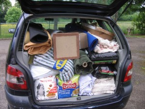 En plus des sacs de croquettes offerts par les clients du magasin, le « gang des Lyonnais » a apporté ses collectes. C’est ainsi que j’ai eu le plaisir de revoir Marie-Hélène, les 3 Sylvie, Monique et Corinne accompagnée de son fils. Et nous avons fait également la connaissance de Laurent et son épouse, de généreux adhérents de Chazay, ainsi que de la sœur de Michèle. Le Scénic s’est ainsi garni de croquettes, moquette, friandises, cols, manteaux, arbre à chat, gamelles et autres couvertures. Corinne a notamment fabriqué un magnifique manteau, qui sera mis en vente prochainement sur le site. Un très grand merci à tous.